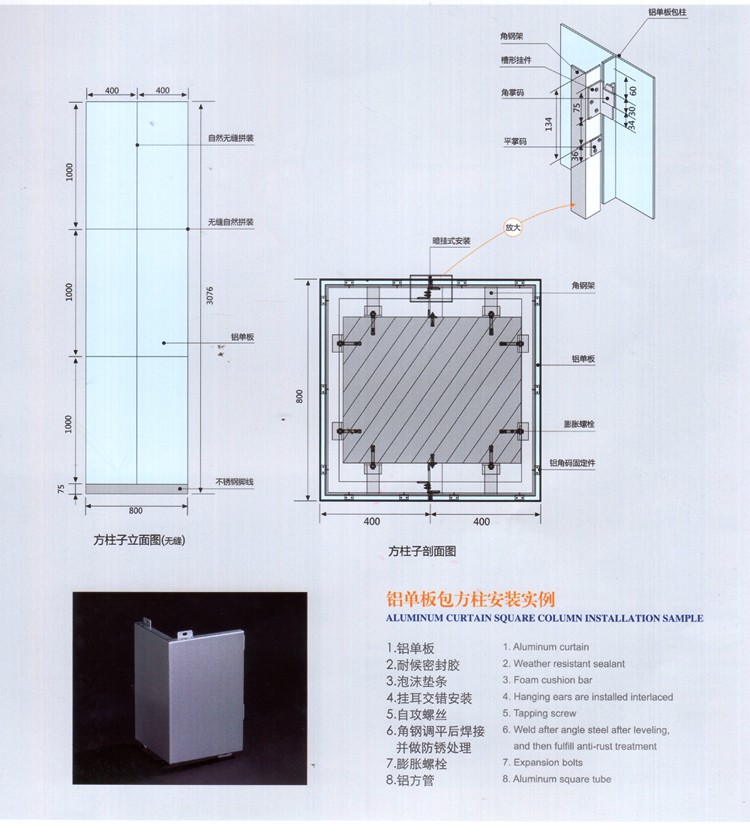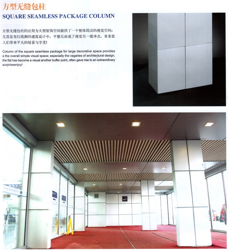 方形無縫包柱鋁單板,它能為大型裝飾空間提供一個整體簡潔的視覺效果,讓人看起來渾然一體,十分自然。在變幻莫測的建筑設計中,平整反而成了視覺的另一個緩沖點,這也是人們喜愛它的原因。